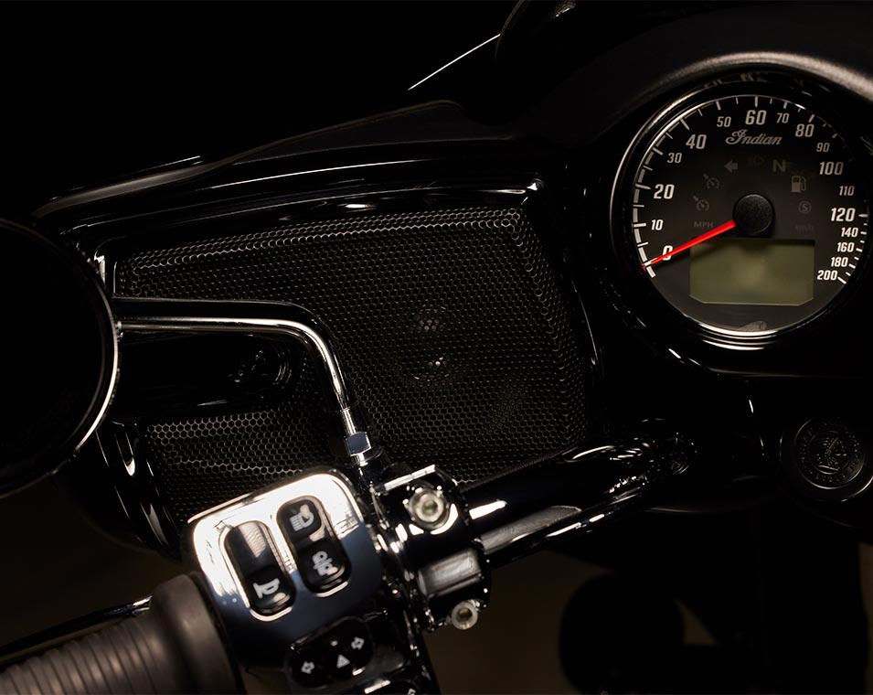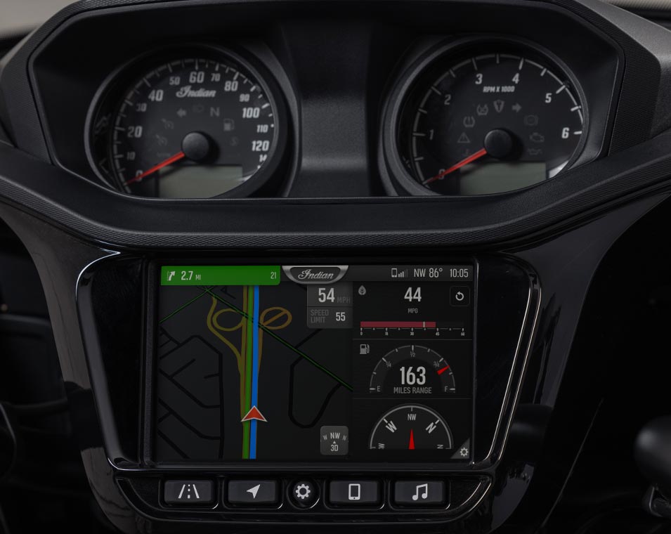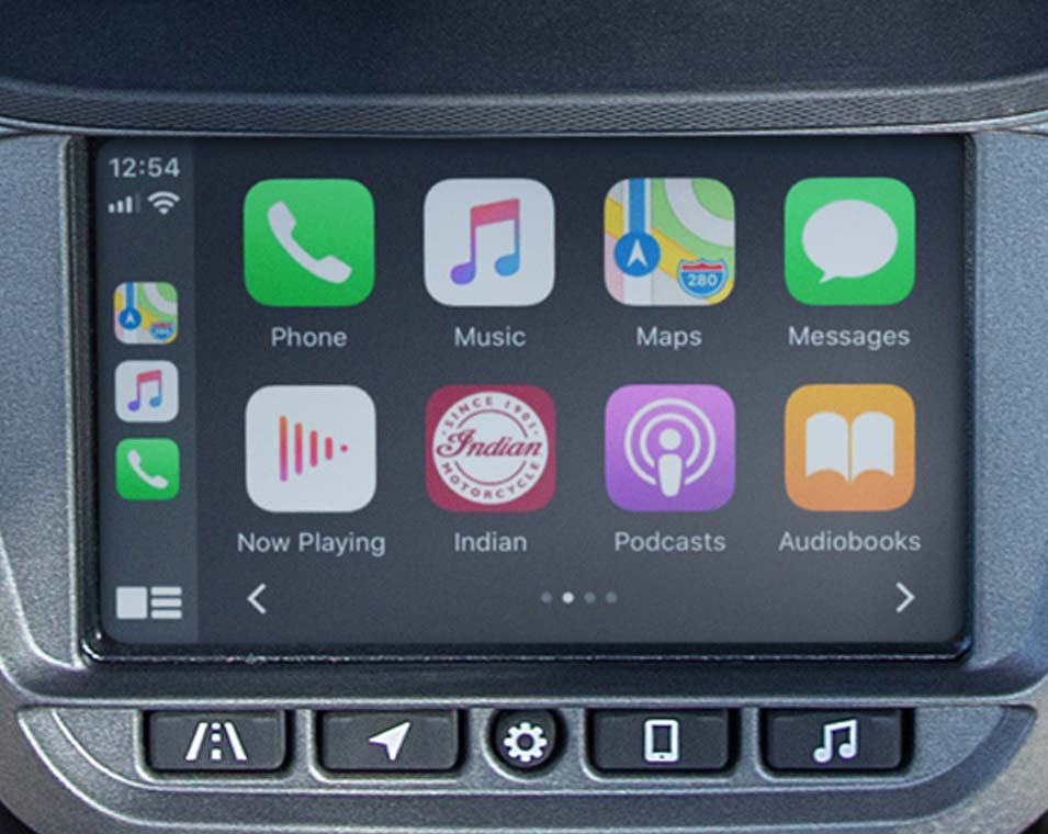 | Infotainment | 7" touchscreen powered by RIDE COMMAND. 7" touchscreen display with real-time clock; ambient air temperature; heading; audio information display; map/navigation; Bluetooth status for phone and headset; vehicle status (tyre pressure, voltage, engine hours, oil change); vehicle info (speed, fuel range, RPM, gear position); current ride data (distance, moving time, stop time, altitude, altitude change); trip meters; ride mode selection; screen brightness; vehicle trouble code readout; Apple CarPlay integration. |