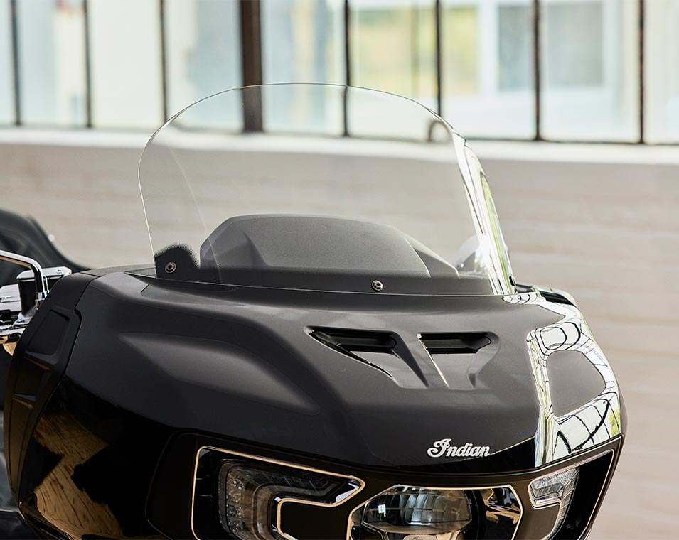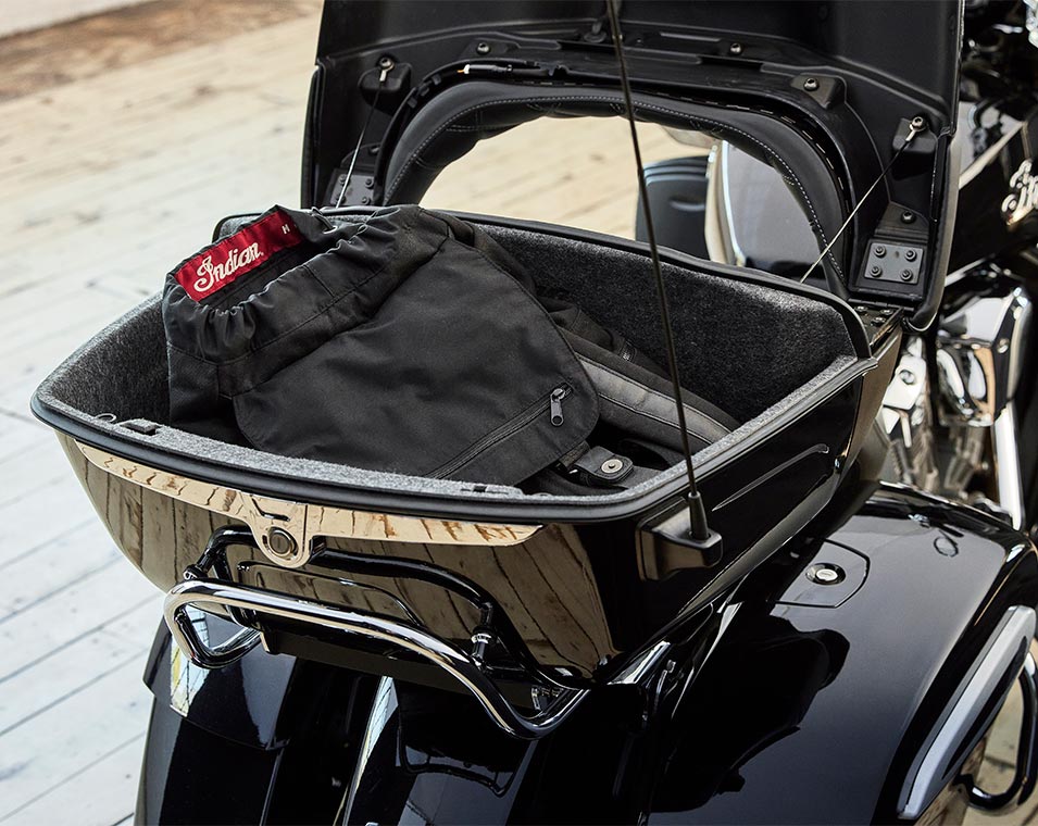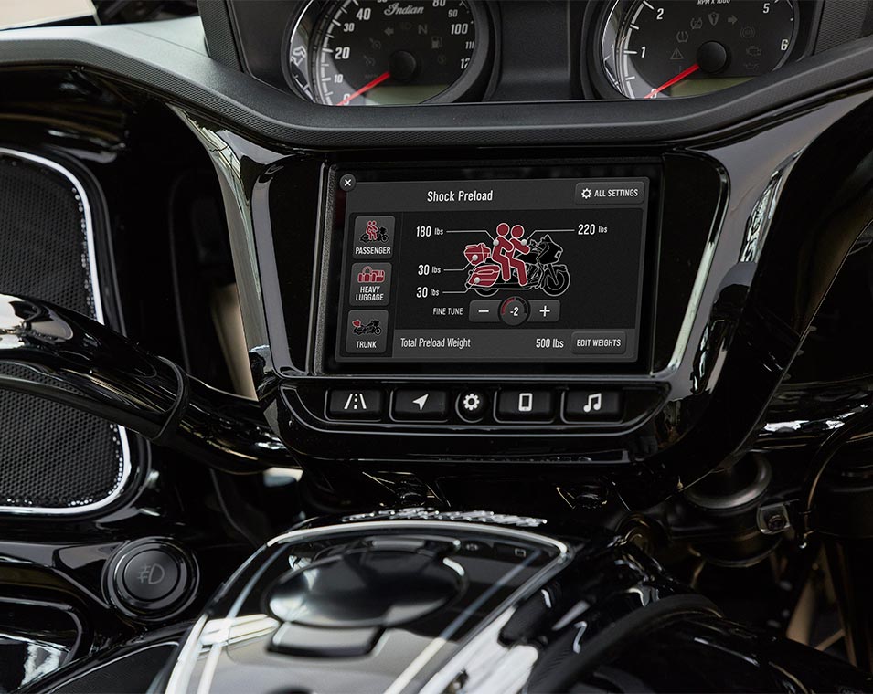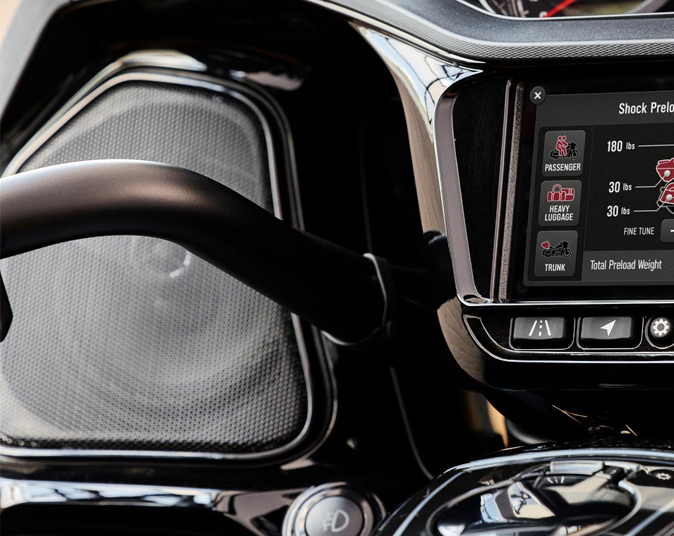 | Standard Equipment | Smart Lean Technology; Electronically Adjustable Rear Suspension Preload; Heated Seat; Integrated Driving Lights in Lower Fairing; Lower Fairing Storage; 7" touchscreen powered by Ride Command with Navigation and Apple CarPlay integration; Selectable Ride Modes; Rear Cylinder Deactivation; Cruise Control; Tyre Pressure Monitoring; Remote-locking Hard Saddlebags & Trunk; 136+ litres of Storage; Highway Bars; Adjustable Passenger Floorboards; Brembo brakes; ABS; Keyless Ignition; Chassis Mounted Fairing; Power Windshield; Adjustable Fairing Air Flow Vents; Heated Grips; 200 Watt Audio System with AM/FM, Bluetooth, USB, Smartphone Compatible Input, and Weatherband; 12V Charging Port |